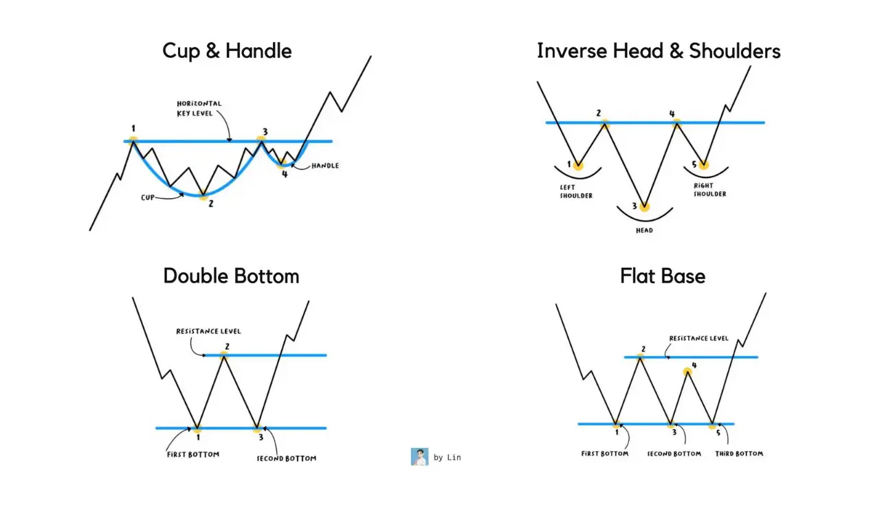 底部形态有几种不同的类型。一些最常见的形态包括: