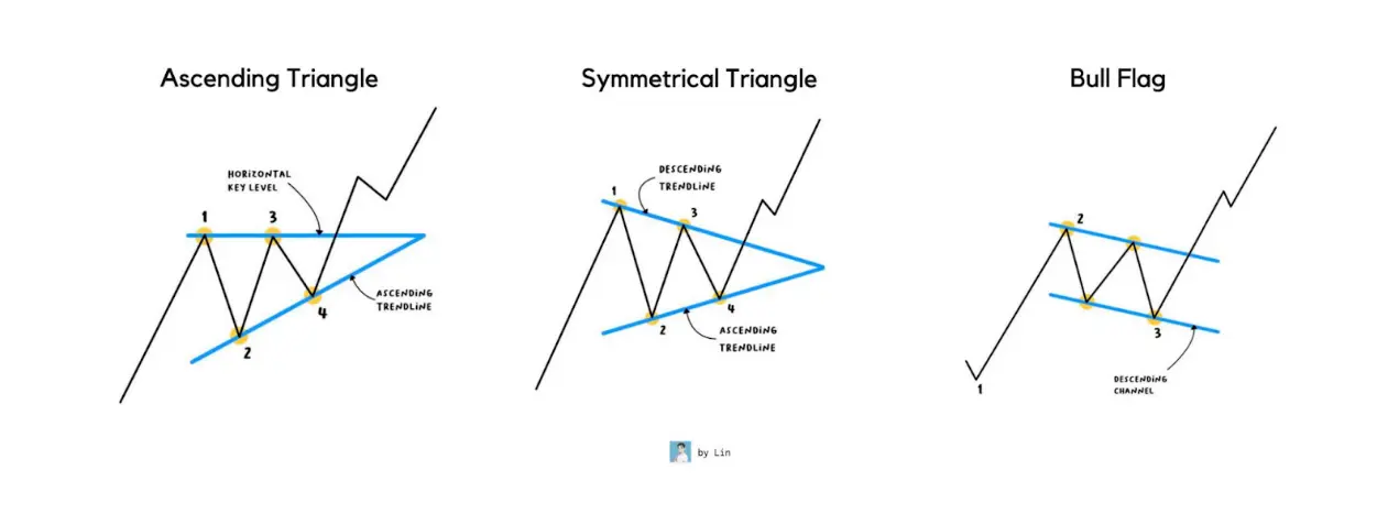 当股价上涨后出现停滞时,这些底部形态被称为持续形态。最常见的持续形态是旗形和三角形。