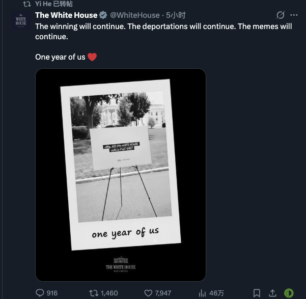 1 月 21 日 11:10,白宫官方在 X 平台发文提及“胜利、驱逐行动与 memes”。一分钟后,Solana 链上迅速出现同名 Meme 币 memes;20 分钟后,BSC 链上版本也紧随诞生。一场两条链之间的 Meme 赛跑正式打响。