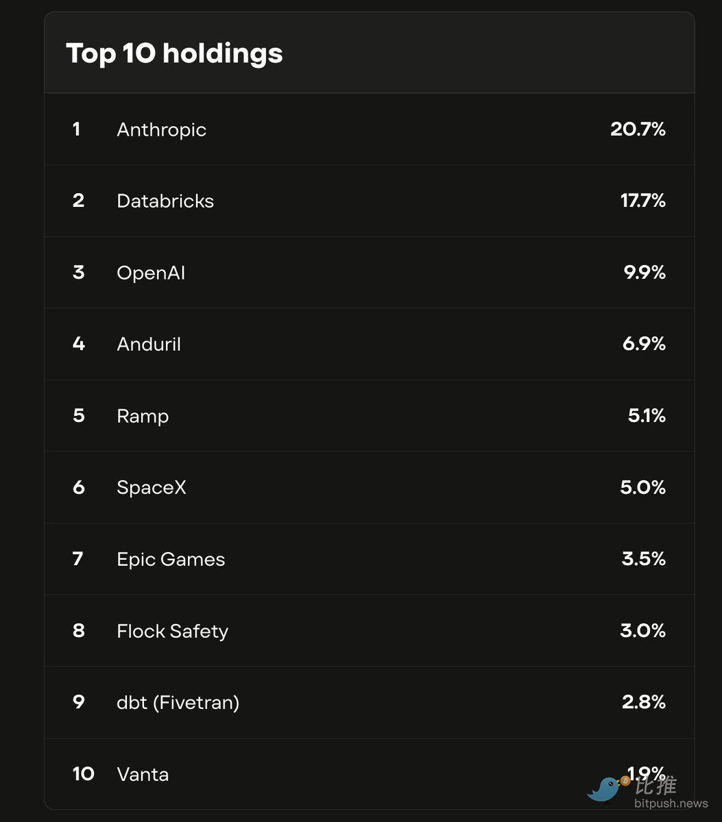 它其实是一只基金。基金里装着 Anthropic、OpenAI、SpaceX 这些公司的股份。其中 Anthropic 占了 21%,OpenAI 占 10%。
