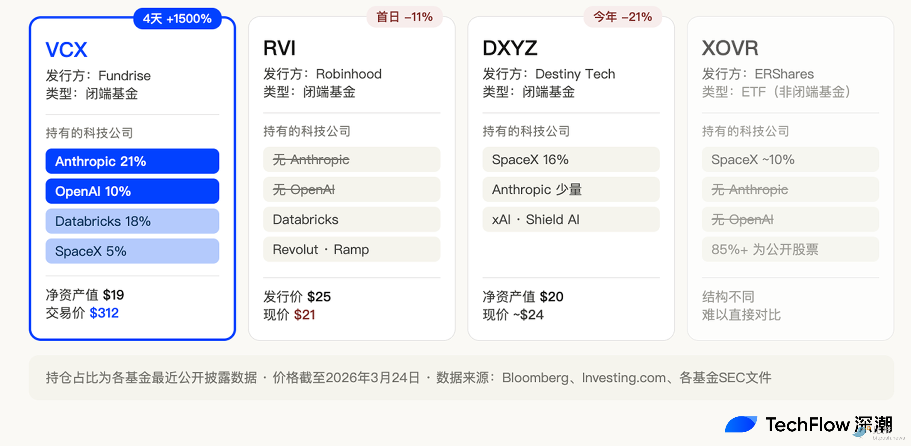 Fundrise 从 2022 年就开始在这两条路上买入,当时私有科技公司的估值刚经历了一轮暴跌,价格便宜。四年下来,攒出了一个包含 Anthropic、OpenAI、SpaceX 的组合。然后装进 VCX,挂到纽交所,普通人就能像买股票一样买入了。