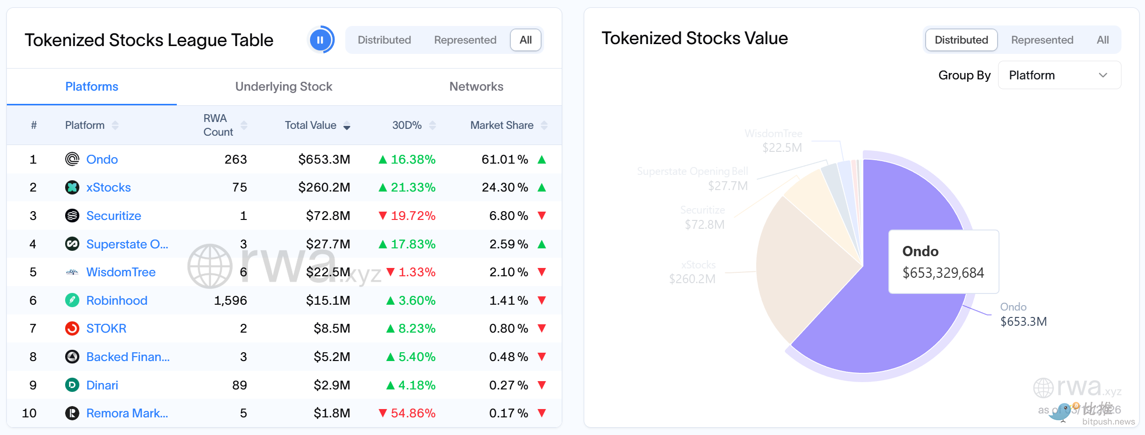 而市场给出的反馈,某种程度上已经印证了这一点:Ondo 的封装模型占据了 60% 的市场份额,而那些尝试采用更严格或更接近原生代币结构的平台,市场份额仅为个位数。