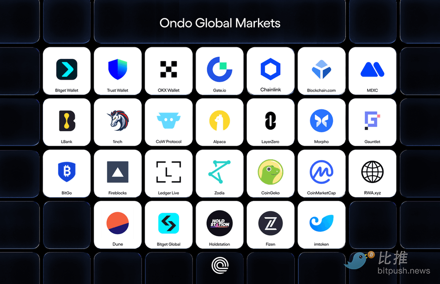 因此在修炼技术与产品内功之外,Ondo 的另一个关键动作,就是通过广泛合作,把 Ondo 代币化股票和 ETF 广泛嵌入进用户最常出现的入口之中。