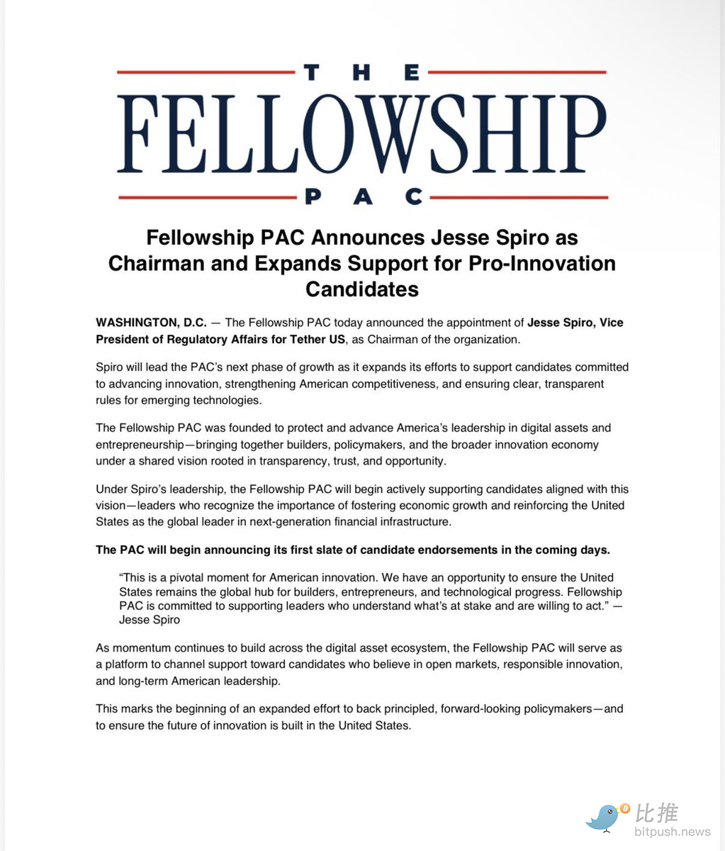 深潮导读:成立七个月、号称筹集逾 1 亿美元却至今未花一分钱的加密超级 PAC Fellowship,周三宣布任命 Tether US 监管事务副总裁 Jesse Spiro 为主席。这是 Tether 与该 PAC 之间首次建立正式公开关联。与此同时,加密行业另一大 PAC Fairshake 已坐拥 1.93 亿美元弹药库,两大 PAC 合计近 3 亿美元的政治资金正瞄准 11 月中期选举,而国会围绕稳定币收益的立法博弈仍悬而未决。