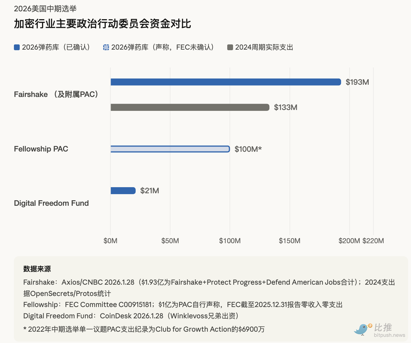 如今,Fellowship 和 Fairshake 两大 PAC 合计近 3 亿美元的弹药库,加上加密行业其他政治捐赠力量,2026 年中期选举有望成为行业政治支出的新纪录。