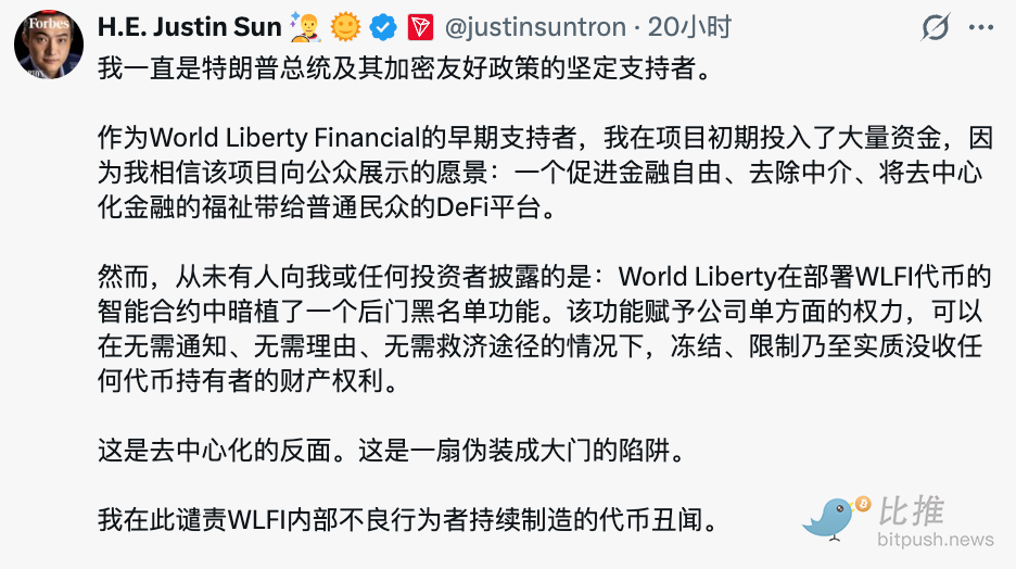 昨天,波场创始人孙宇晨在 X 上发了一篇长文,指控特朗普家族旗下的 DeFi 项目 World Liberty Financial 在代币合约里暗藏冻结后门,把投资者当「个人提款机」。