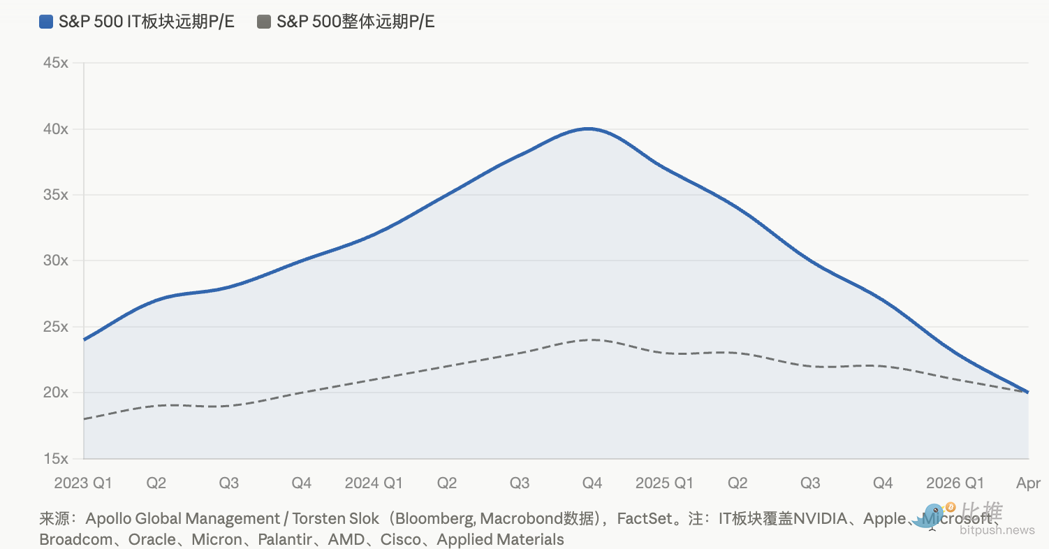 据 Apollo 全球管理 4 月 11 日发布的 Daily Spark 研报,该公司合伙人、首席经济学家 Torsten Slok 用一张图表揭示了当前科技股的处境:标普 500 信息技术板块的远期市盈率已从 AI 热潮期间约 40 倍的高点压缩至约 20 倍,回到了 AI 繁荣启动前的估值水平。