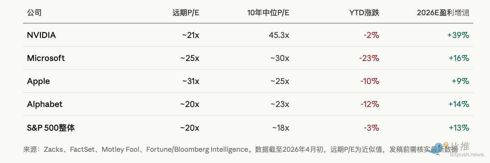 Zacks 分析师的判断更为务实:股价下跌的同时盈利预期在上调,导致估值倍数被动压缩,部分个股的风险收益比正在改善。英伟达在当前估值下被认为是增长与估值匹配度最高的标的,而微软则被视为具备「追赶性反弹」潜力的方向。