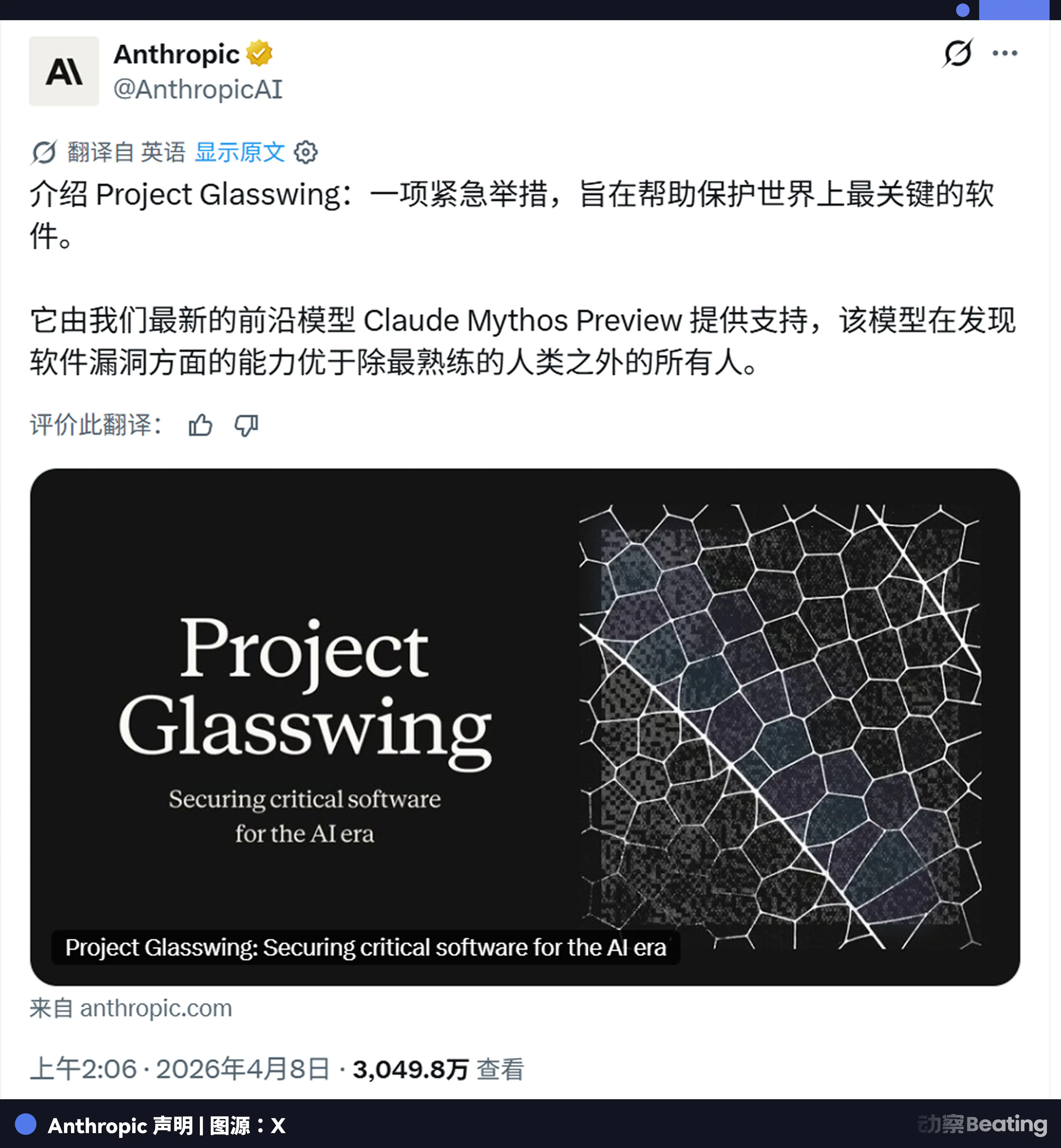 4 月 7 日,Anthropic 宣布了它有史以来最强大的模型 Claude Mythos Preview,同时宣布不公开发布这个模型。取而代之的是一个限制性访问计划 Project Glasswing,让 12 个核心合作伙伴用 Mythos 来扫描和修复关键软件中的零日漏洞。