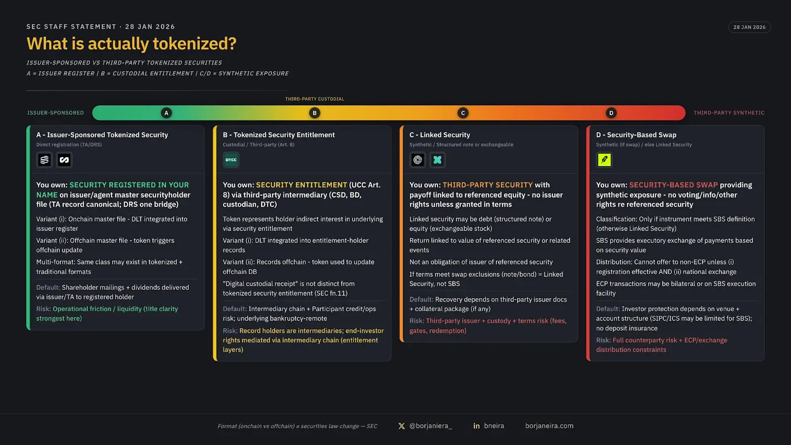 SEC在2026年1月的声明不仅重申了"代币化证券仍是证券",还制定了关于代币化实际运作方式的精确分类。研究员Borja Neira (@borjaneira_) 绘制了这一框架最清晰的可视化图表之一,展现了从发行人赞助到第三方合成的演变图谱。