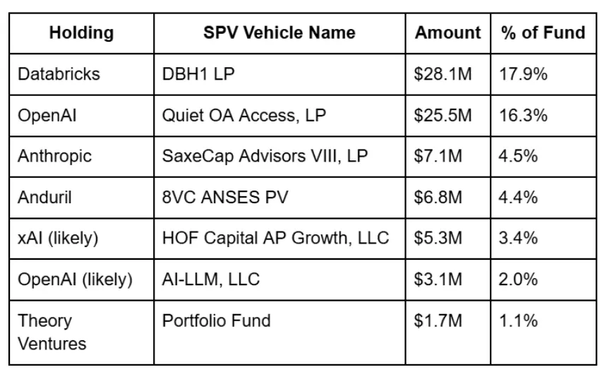 正如AccessIPOs记录的那样,该基金的持股名单读起来就像一份晚期AI项目的名人录:Databricks(2800万美元,通过DBH1 LP)、OpenAI(2550万美元,通过Quiet OA Access, LP)、Service Titan(2130万美元)、dbt Labs(1500万美元)、Anthropic(700万美元,通过SaxeCap Advisors VIII, LP)、Anduril(680万美元,通过8VC ANSES PV)、Canva(620万美元)。