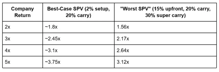 晚期AI项目的跟投需求无限,但里面充斥着未经批准的SPV和足以摧毁回报的极高费用——观察到的一个例子是:15%的前期费用 + 20%的附带权益(Carry)+ 超过两倍回报部分的30%。